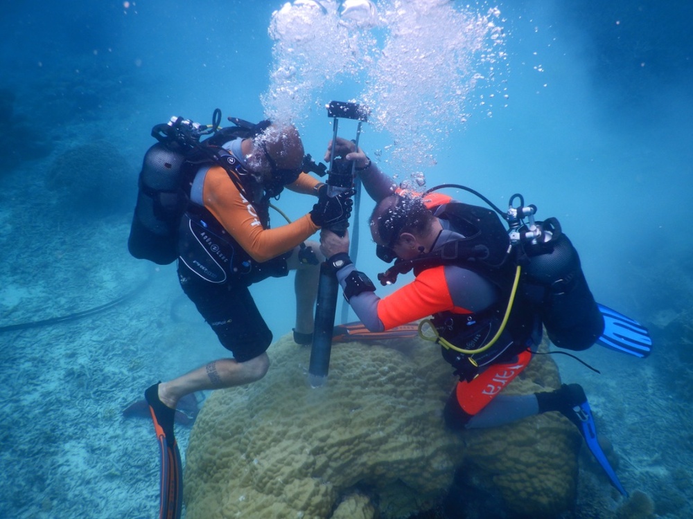 Researchers extract core samples from a coral reef in Palau during the Tara Pacific Expedition. Photo: Stephanie Reynaud