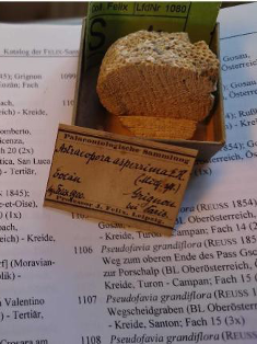 Image: Fossil coral specimen in the foreground with a background of German references.