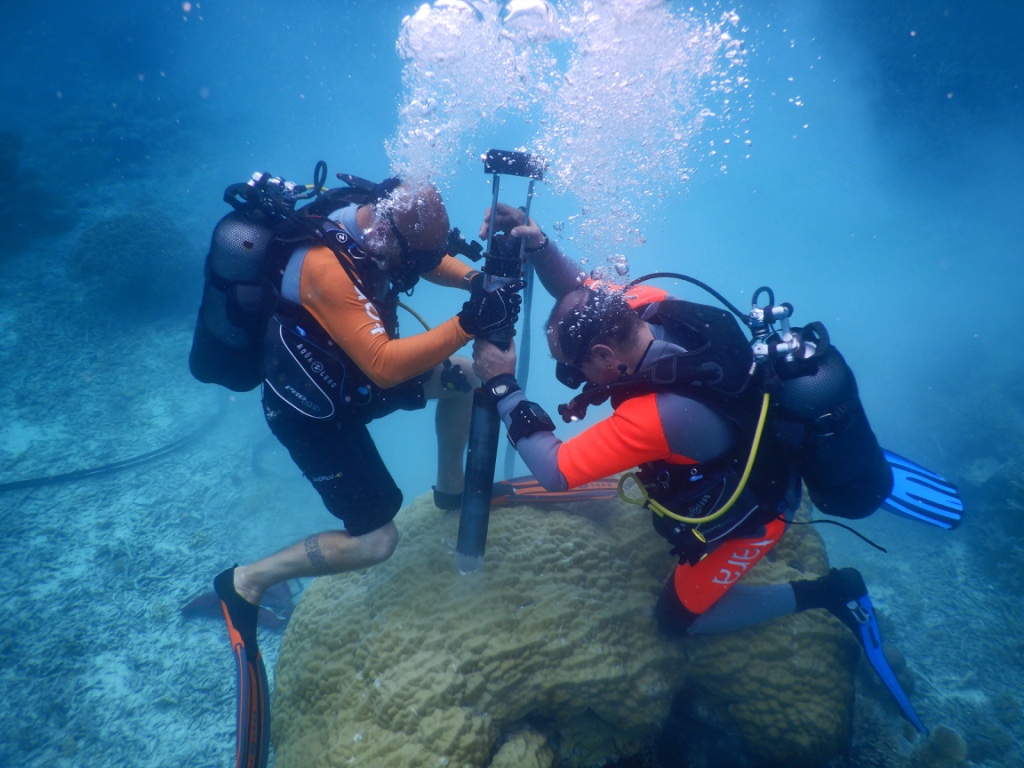Two divers sample a coral core during the Tara Pacific Expedition (Image credit: Stephanie Reynaud)
